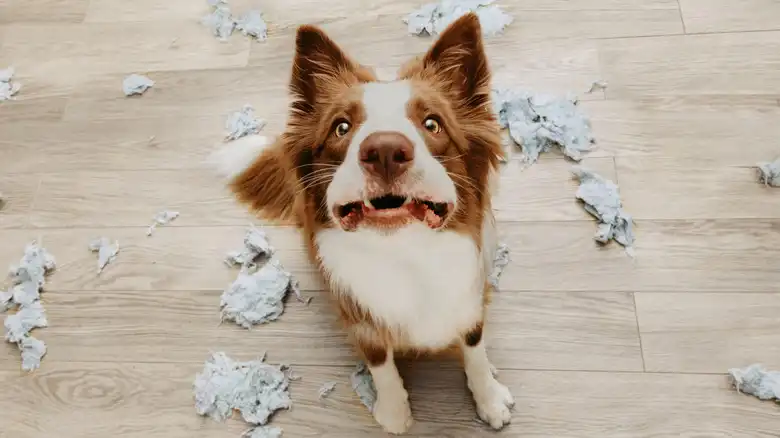 No dog owner survives pet parenthood with all their shoes, socks, rugs, or pillows intact. However, if your dog goes a little extra bonkers with the chewing, scratching, or shredding when you leave them alone, you can be relatively sure that they are taking out their anxiety on your carpet or your table legs. The best thing to do when your dog is exhibiting destructive behavior is to remove any objects that could potentially hurt your pet from the area they'll be staying in. Don't leave chocolate on the counter or wires plugged in if you know your pup will go to town on them.